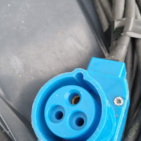 Plugges inn i skjøteledning du normalt kobler i bilen eller vognen med 16A Cee støpsel, og andre enden i vognen eller bobilen.