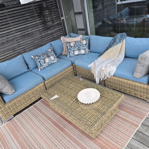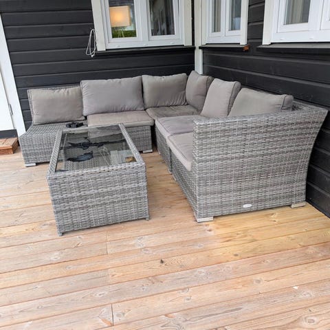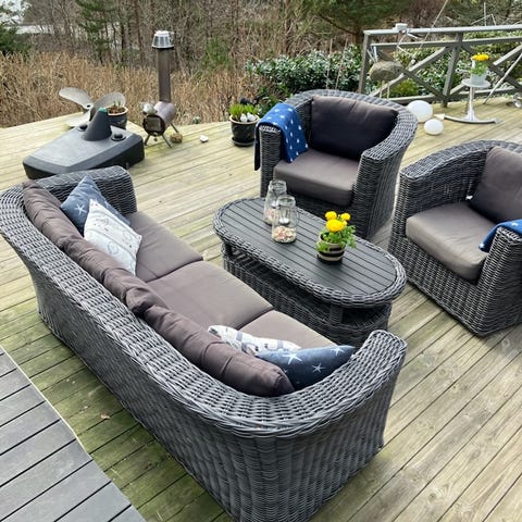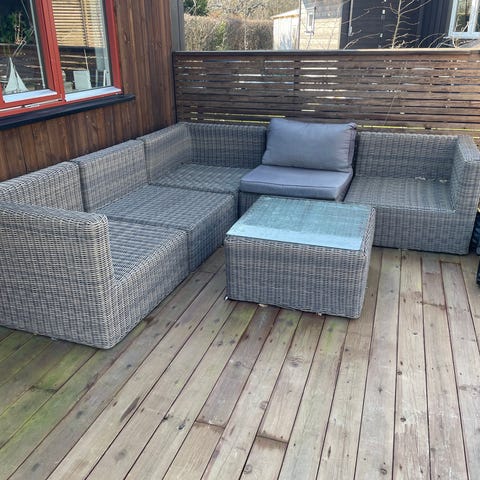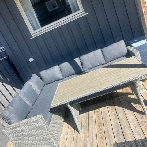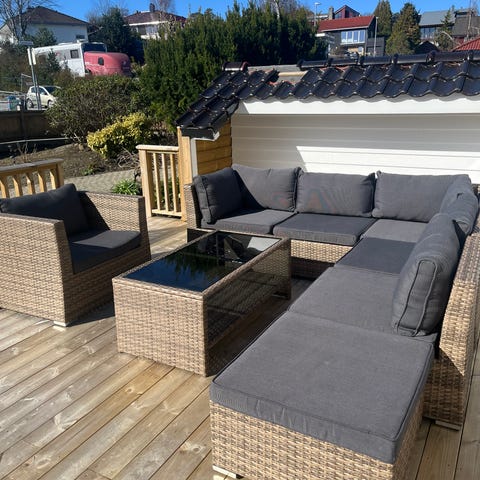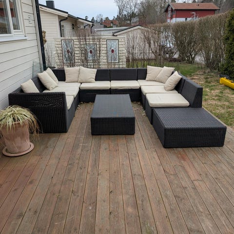Flott Hillestorp Bahamas modulsofagruppe i kunstrotting selges. 7 sitteplasser i sofaen + 2 puffer, og bord m/hylle under og glassplate. Det følger også med glassplater til puffene, så disse kan brukes som ekstra bord. Komplett med puter til både sofa og puffer. Sofaen kan deles i seksjoner. Noen ekstra putetrekk medfølger. Møblene er lagret tørt hver vinter. Ca 4 år gammel. Målene på sofaen er nå 343x143cm. Og hver seksjon er 63cm. Så det er enkelt å fjerne en eller flere seksjoner om den blir for stor. Puffene kan også hektes på endene Så den blir dypere. Et snev av løs film under glassplate til bordet.
