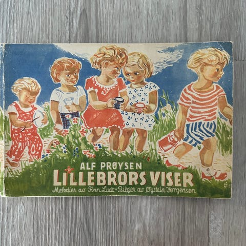 1.utgave 1.opplag Oslo 1949. Rikt illustrert i farver. Orig. kartonert omsl. *Prøysen første visesamling for barn, inneholdende bl.a. Lillebrors vise, Pelles bursdag, Blåbærturen og Lille Måltrost. Upaginert. Gjennomillustrert i svart/hvitt og farver. Uvanlig