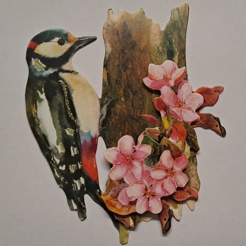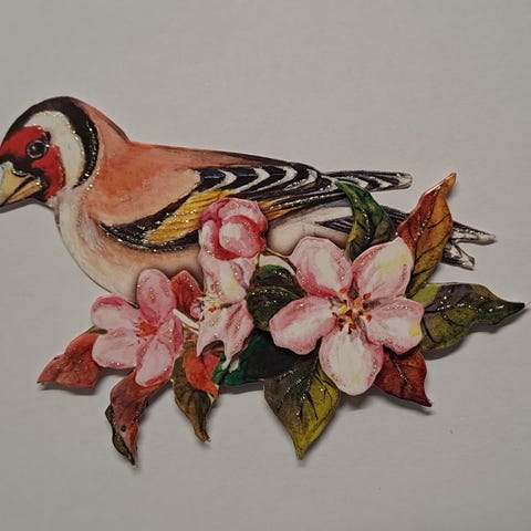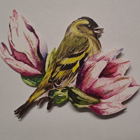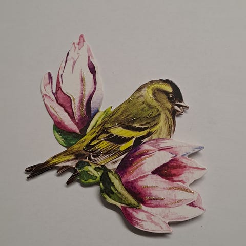 scrapbooking, kortlaging, pynt. fugl, undulat og blomster