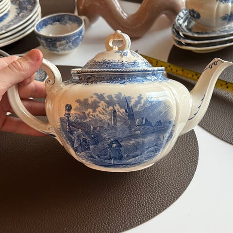 Selger med tungt hjerte, mugge fra Villeroy & Boch, modell Burgenland Blå, produsert i Tyskland. Arvet etter min oldefar.