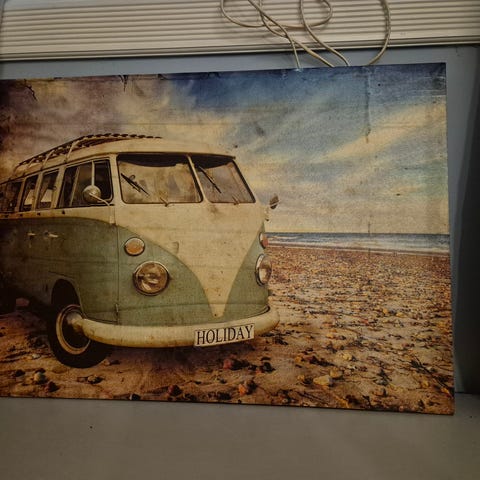 Dekorativ metallskilt av en rustikk VW Beetle.