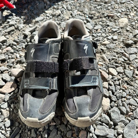 Sykkelsko til landeveispedaler, brukt i noen år men fortsatt fine. Klikkspenne øverst, borrelåsspenne under