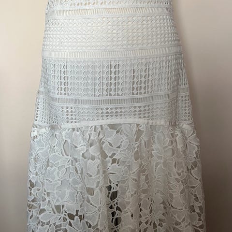 Lekkert og spesielt skjørt i hvitt med broderte detaljer. Størrelse 38. 100% bomull. Merke: Essentiel Antwerp. Foret. Passer til ulike anledninger med sitt elegante utseende.