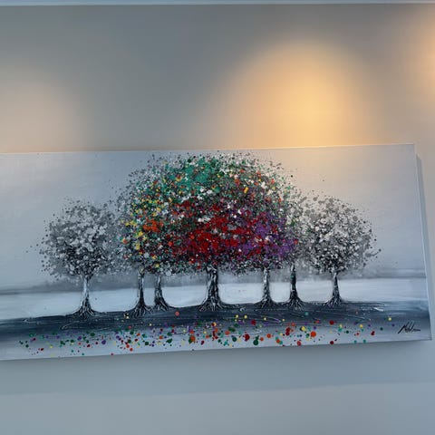 Selger et iøynefallende og fargerikt maleri i akryl på lerret. Størrelse: 100 x 100 cm.