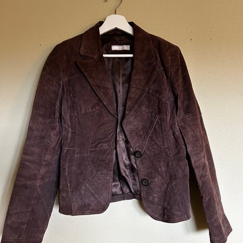 Vintage damejakke i skinn og juksepels fra Mang. Str.S. Skinnet er svartnet en del enkelte steder, særlig på armene, mulig lar seg gjøre å rense(?). Selges 1800