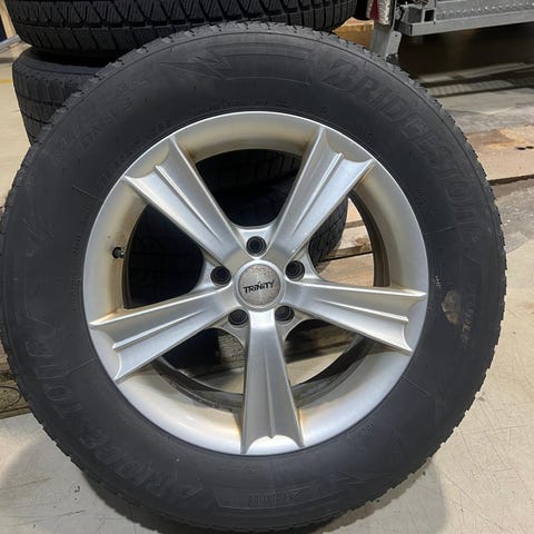 Selger fire vinterdekk på felg som kun har vært i bruk en halv vinter. Det ene dekket har fått en kantsmell. Felgen er hel, men dekket har fått trådspreng langs ca 30cm.