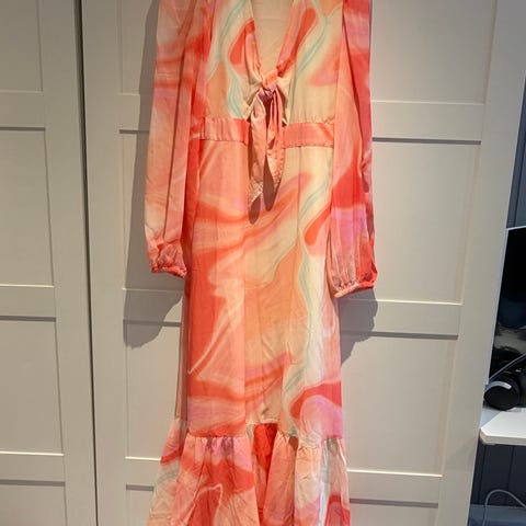 Kragen er to lange deler, de kan knyttes som sløyfe eller knute. Ledig og veldig flatterende passform.