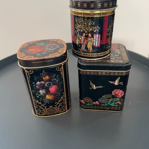 Selger en pent brukt teboks i metall med to rom og lokk.