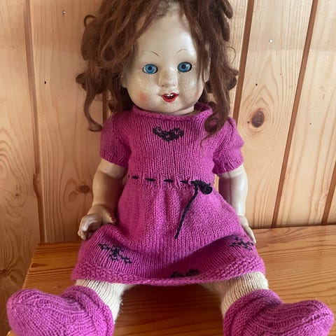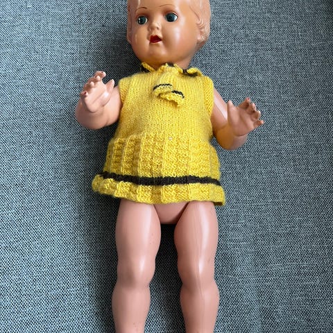 En vintage celloloiddukke fra 1950 selges. Dukken er ca. 50 cm høy og har formet hår.