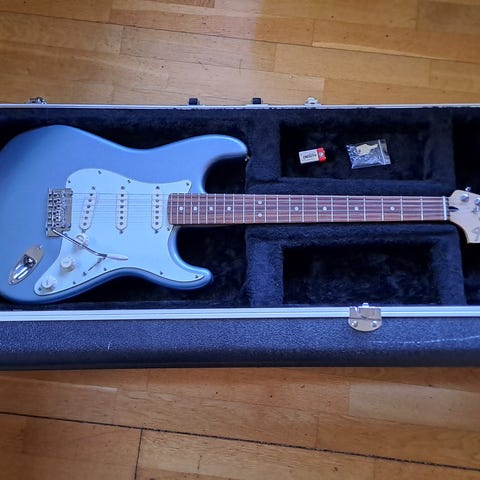 Dette er en pen ordentlig Strat med byttet pickupser som er skiftet til Hot Noiseless fra Fender. Originale følger ikke med. Oversadelen er Graptech. Fått på nye .10-.52 EB strenger. Det er en made in Mexico 2018 player Tidepool.