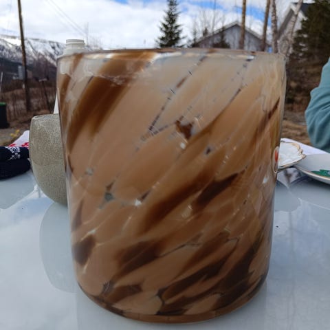 Metall på toppen og i foten, treverk rundt glasset.