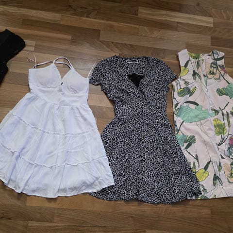 Pakken inneholder alt fra flere dongeribukser, joggebukser, tights, dressbukse, hettegensere, pysj, bikinitopper, badedrakt, tynne gensere, topper, tshorter, treningstopp, veske, shorts, joggeshorts, skjørt, jakke, sekk, med mer. Noe nytt med merkelapp på. Håper noen andre kan få bruk for dette!