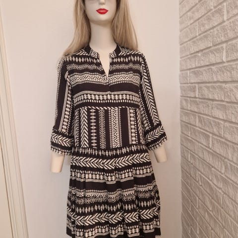 Materiale: Stoffet har en let krøllet eller struktureret overflade, bomuldsblanding med crepe-effekt. Kjort er stretch oc tilpasse seg fint mot kroppen.
