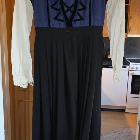 Jeg selger denne fine festdrakten fordi jeg har fått meg bunad. Jeg har brukt denne festdrakten i 2 år. Den kommer med skjorte, veske og kåpe. Jeg har sydd litt om på knappene på vesten slik at den skulle passe meg bedre. Den vil passe en som er rund 160cm