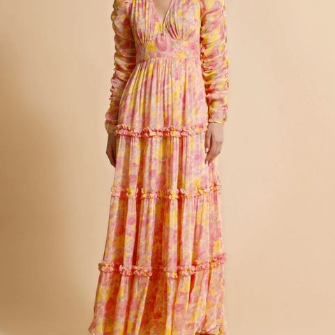 Mønsteret på kjolen er lagd i «metalliske» tråder. Noen steder i sømmen treffer disse trådene sømmen og kan derfor se litt «dratt» ut. Se de siste bildene. Dette er slik kjolen er og ikke noe jeg har gjort, men velger å opplyse om det selvom slik at kjolen er godt beskrevet.