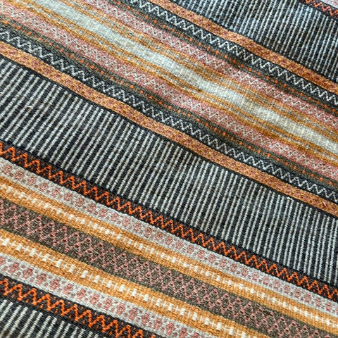 Det er i god kvalitet, vevd i ulltrå plantefarvet og renning i lintrå.