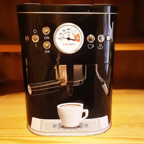 Pen boks i blikk til oppbevaring av kaffe. Plastlokk