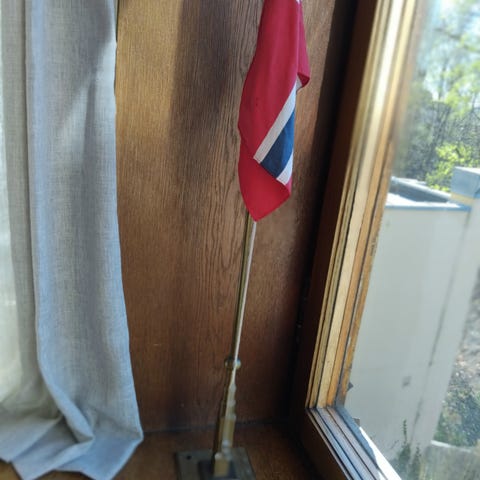 Antikk bordsflagg med Norges flagg og stilig løve