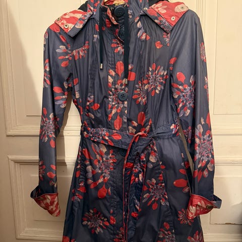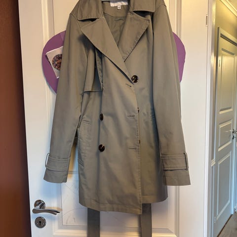 Flott trenchcoat med fint snitt, lommer, belte og foret for å sitte pent på. Den er aldri brukt og jeg har heller ikke snittet opp stingene i splitten bak (se bilde).