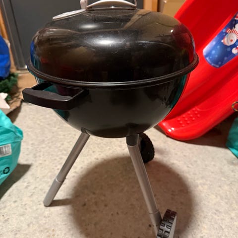 Lekegrill med grillkull som lyser og spraker. Med lighter for å "tenne på" kullet.