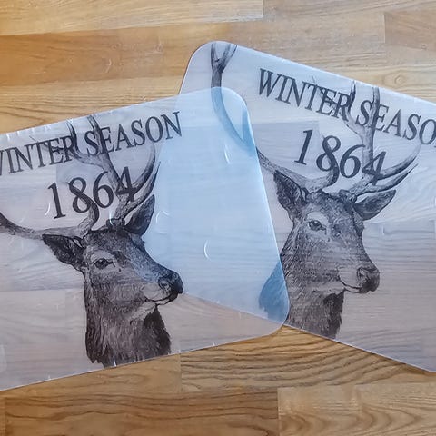 4 stk. Bordbrikker i plastmateriale med forskjellige motiv.