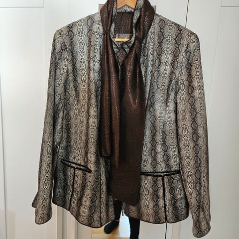 Håndlaget skinnjakke i myk lammenappa i norsk design. Er størrelse 38 men jeg er 36, så vil tippe den passer 34-38.
