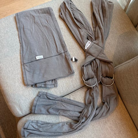Bæresjal fra caboo med ringer for feste. Holder barnet tett på kroppen fra nyfødt til 14.55 kg. Lett å feste, og medfølger et belte med lomme som festes utenpå.
