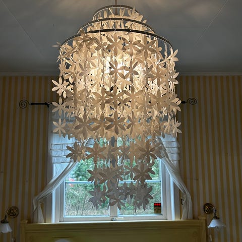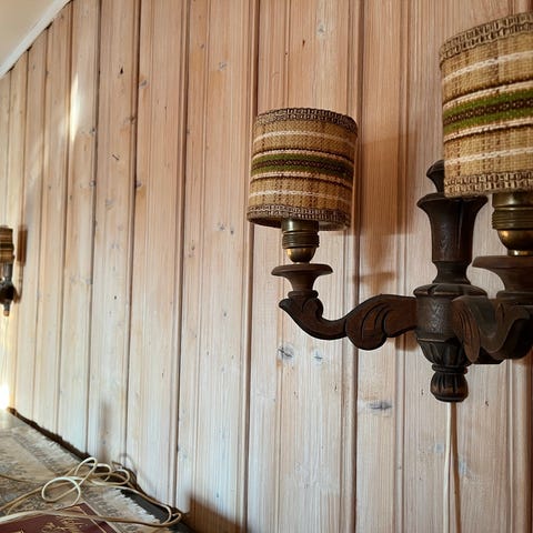 Pent brukte vegglamper og lysekrone i metall i samme design fra Italia.
