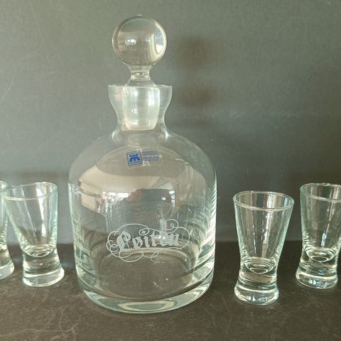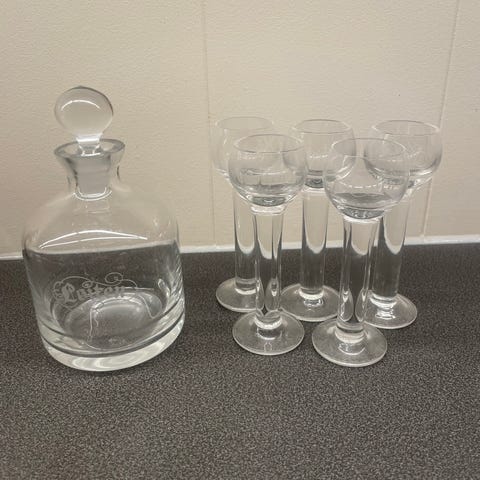 Selger nesten ny Løiten akevitt glass 6 stk. og 1 karaffel. Karaffelen 0,5 L. Glassene og karaffelen er lite brukt og fremstår som nytt. Nypris pr. glass 199,- kr. Karaffel 399,- totalt pris : 1593,- kr. Selges samlet for 800,- kr. Kan hentes fra Oslo sentrum etter avtale.