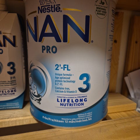 Uåpnet Nan Pro 2 800g boks med morsmelkerstatning selges for 150kr. Utgangsdato mars 2026. Står oppbevart i mørk og kjølig bod.
