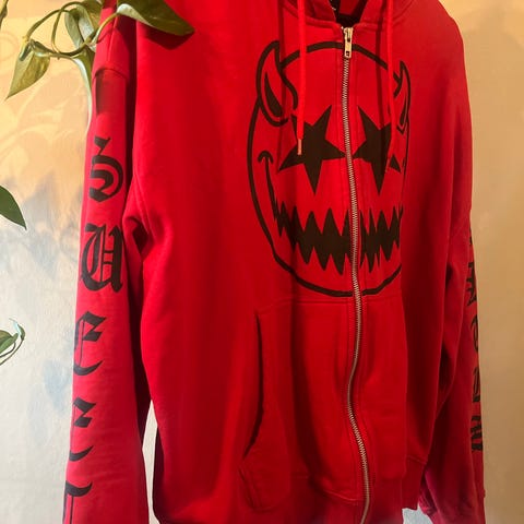 Hettegenser i størrelse M, farge rød,grønn, lilla, svart eller rosa. Laget av bommulsstoff med glidelås foran og hette med snøring. Designet er solid og kult.
