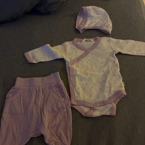 Beige omslagsbody med blomster og rosa bukse som passer til. Veldig mykt og godt!
