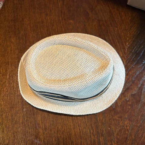 Hatt laget av 100% paper straw i størrelse M. Hatten er brun med et grått bånd rundt. Den har en klassisk form med bremme.