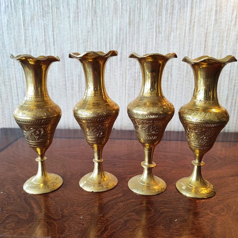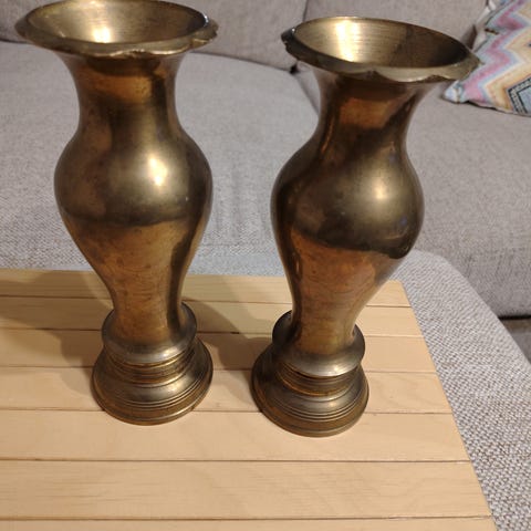 Selger 4 stk messing vaser og en bolle i nydelig orientalsk mønster( bollen er muligens til å ha røkelse i, eller blomster) En god del patina. Se mål på bildene. Selges samlet. Kan sendes mot at kjøper står for frakt, eller hentes i Moss. Se gjerne mine andre annonser☺️