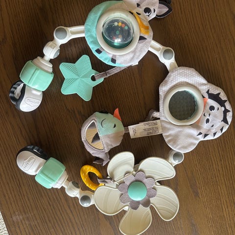En morsom aktivitetspute som kan følge babyen gjennom dagen. Den kan brukes på to måter: