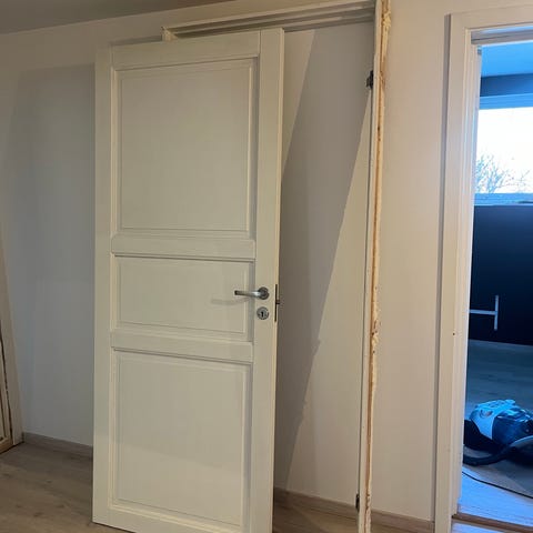Pent brukt dørblad til salgs, str 80x200 cm. Dørkarm følger ikke med. Må hentes i Sandefjord