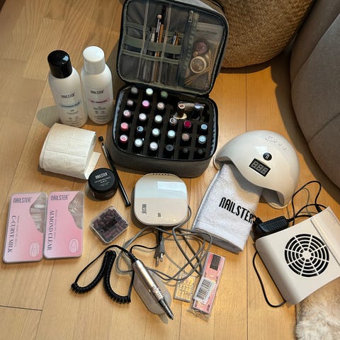 Jeg selger mitt utstyr for påføring av gelé negler. Noe er litt brukt, mens annet er ikke brukt i det hele tatt (den ene flasken med rosa skrift er nesten tom).