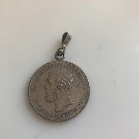 Britisk mynt 1965 med portrett av Winston og Elisabeth ,brukt som anheng