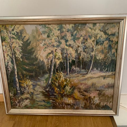 Selger et koselig maleri av dompap. Innrammet i en fin ramme. Dette maleriet formidler en varm og stille nostalgi fra en annen tid. Fuglekassa, værbitt og enkel, står som et symbol på det som var – et liv nært naturen, der ting fikk ta tid og hvert sted hadde sin egen historie.