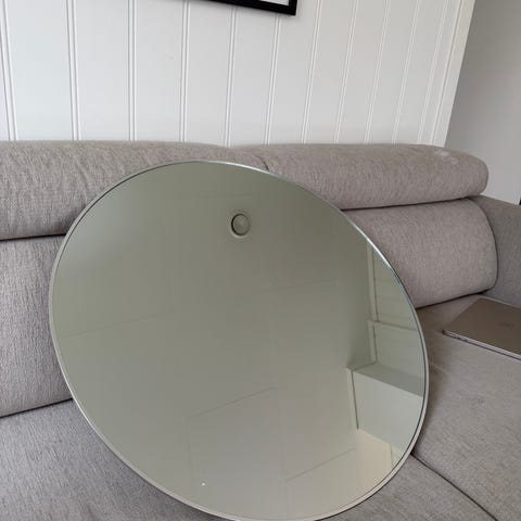 Det er flere riper langs kanten rundt speilet, da det dessverre har ramlet i gulvet. Selve speilet er ikke skadet foruten en ripe midt i glasset, men selve kanten har flere riper, ingen knust glass.