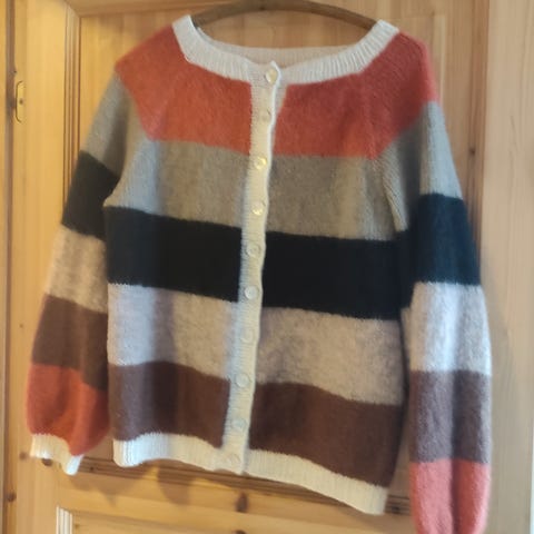 Laget av 80% kid mohair, 17% polyamid og 3% elastan. Merke: Simplicity New York. Laget i Italia.