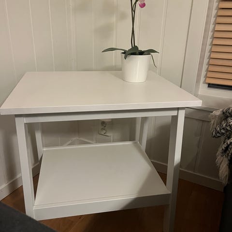 To små hvite, praktiske bord. Robuste og solide. Bena kan enkelt skrus av og settes på. 50 kr for hver, ved kjøp av begge samlet blir det totalt 80 kr.