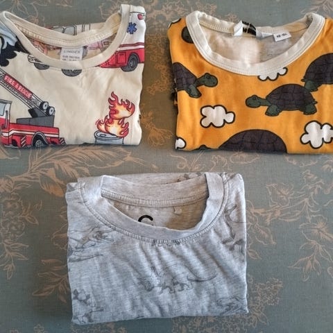 Sett med barn T-skjorter i flerfarget design, størrelse 98 - 104 for gutt. Inkluderer forskjellige mønstre og farger, ideelt for variert bruk i hverdagen. Passer for barn i alderen rundt 2-3 år.