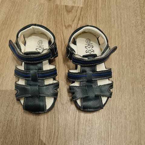 Ubrukte mørke blå sandaler i str. 23 (ca. 14 cm) fra Din sko til gutt - militærmønster og borrelås. Aldri brukt her da de var for små da de skulle tas i bruk. Skoene har justerbare stropper med borrelås - 3 steder på hver sko. NB! Den ene sålen har en liten strek/rift bak i hælen, se bilde markert med ring rundt 😊