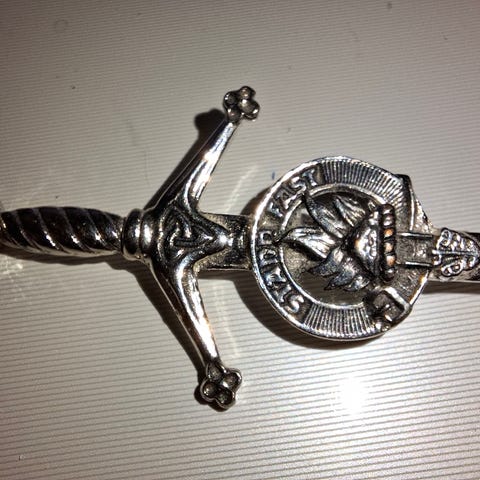 Teksten på våpenskjoldet er latin, og betyr: "jeg vil fullføre løpet"! Dette er fra den skotske klanen "Hunter". Nålen bæres stolt på en glengarry (båtlue), gjerne sammen med en stor fjær fra en falk, eller en tiur. Kan også brukes på en balmoral (rund beret-liknende lue med en rund dusk på toppen).