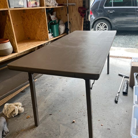 Arbeidsbord eller skrivebenk i metall. Glassplate på topp. Brukt til verksted og garasje. Høyde regulerbar arbeidshøyde.