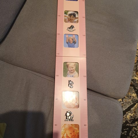 Fargerik og morsom høydemåler for barn, dekorert med fotspor-motiv. Måler høyde fra 0 til 105 cm. Perfekt for barnerom, barnehage eller helsestasjon. Brukt med synlig slitasje, men fullt funksjonell.