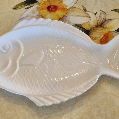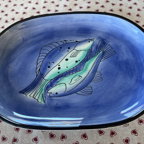 Selges samlet 4stk porselen fiske tallerkner, hele og pene. Har ikke noe navn/merke på disse. Lengde 36.5 høyde 23.5