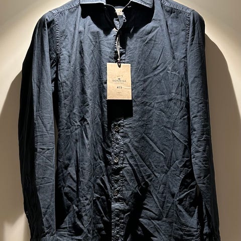 Er merket slim fit, men er åpnet bak så størrelsen er mer lik contemporary
